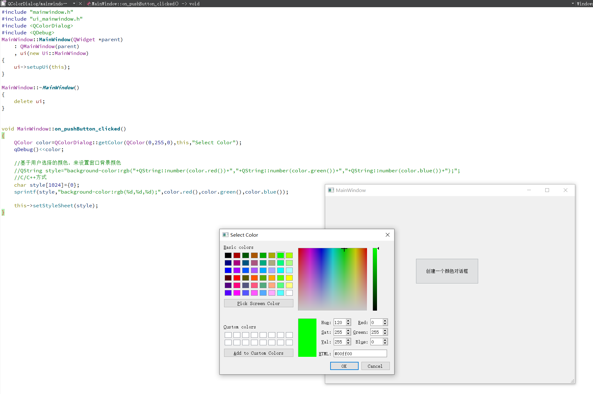 这章节讲的,只要是静态函数,都是模块属性的),用户选择颜色之后,点击确定,对话框就会关闭,而函数返回值就是用户选择的颜色值。所以说和之前QMessageBox::information是一样的道理,不必创建对话框对象,就可以直接使用。程序的功能是基于用户选择的颜色修改窗口的背景色,可以通过QSS来设置,在代码中演示了两种编写QSS的方式,这边只需要了解,后面章节会详细说明