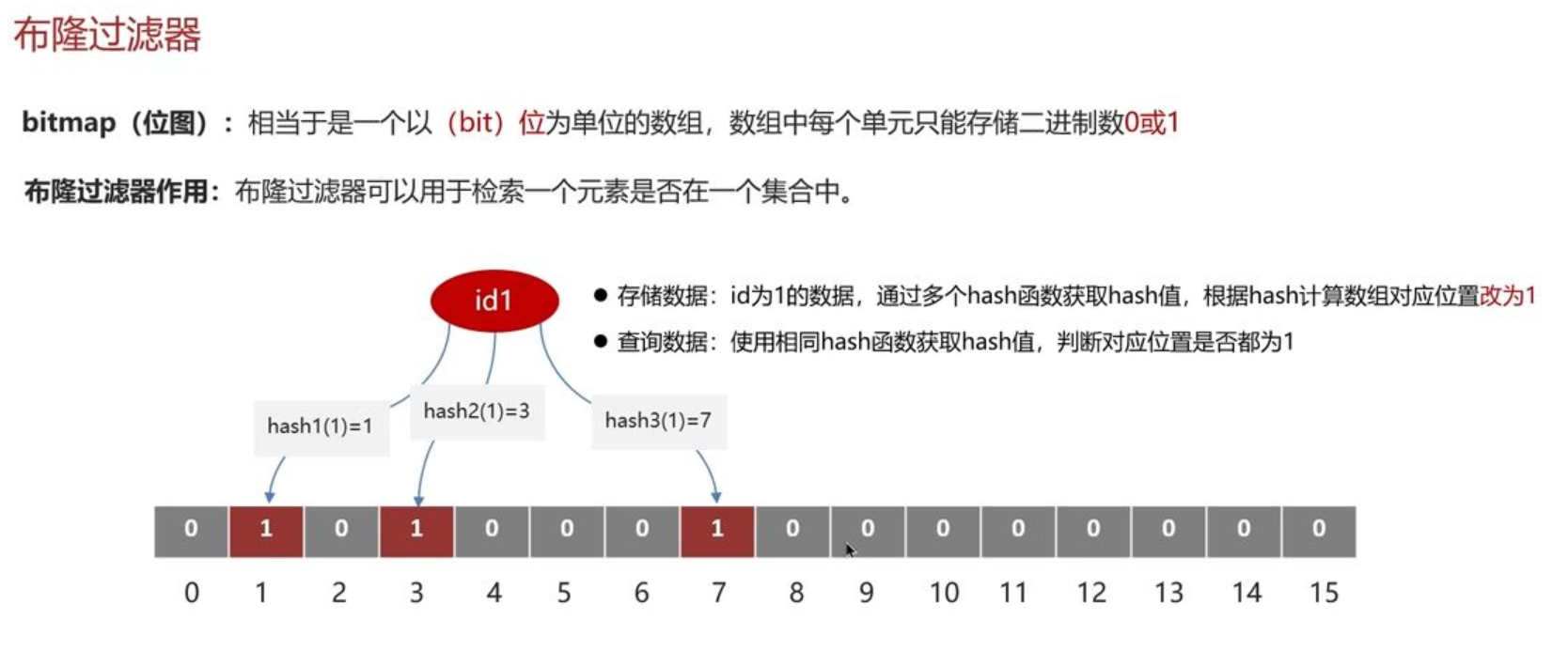 他的底层主要是先去初始化一个比较大的数组, 里面存放的二进制的0或1. 在一开始都是0, 当一个key来了之后经过3次hash计算,模于数组长度找到数据的下标然后把数组中原来的0改为1, 这样的话, 三个数组的位置就能标明一个key的存在. 查找过程也是一样的.