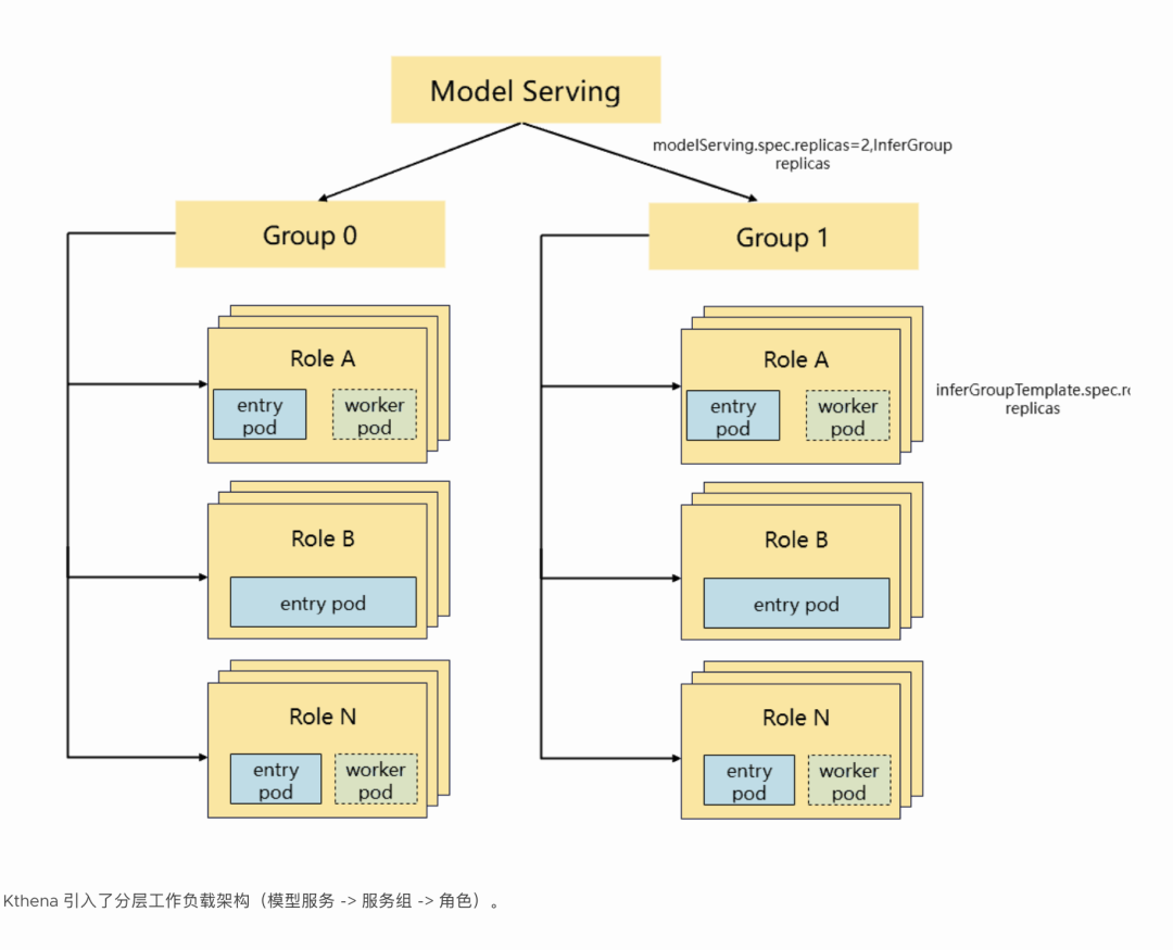 Kthena 引入了分层工作负载架构(模型服务 -> 服务组 -> 角色)。