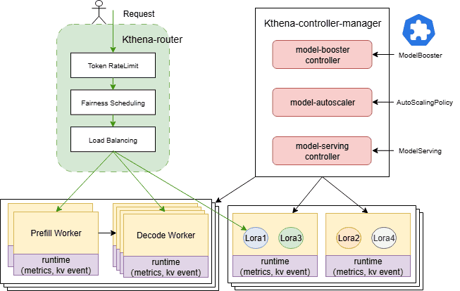 Kthena 的设计初衷正是为了应对这些挑战。它并非取代现有的推理引擎(例如 vLLM 或 SGLang),而是作为其之上的智能编排层,并与 Kubernetes 深度集成。