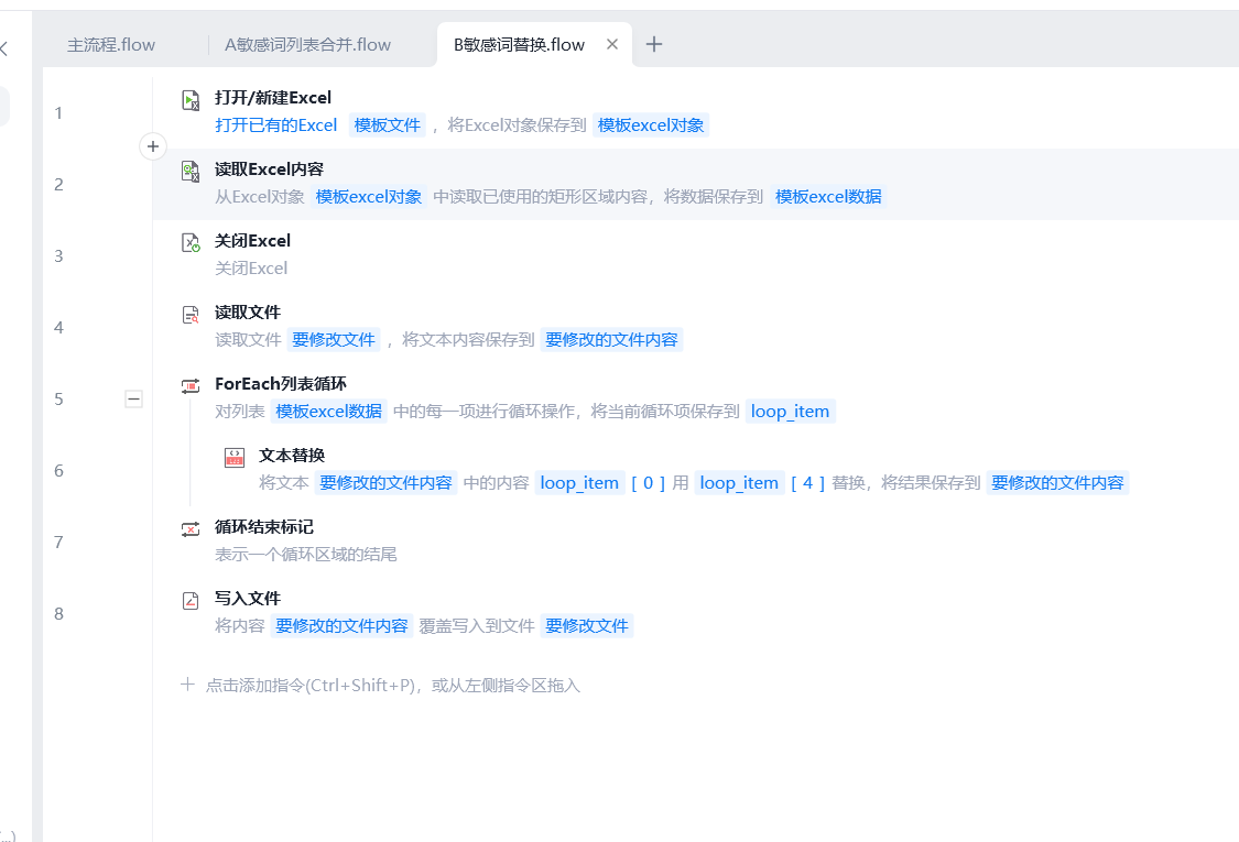 - 循环替换敏感词:使用 "循环列表" 组件,遍历敏感词表格中的每个敏感词及其替换词。在循环体内,使用 "替换文本" 组件,将文档内容中的敏感词替换为对应的替换词。