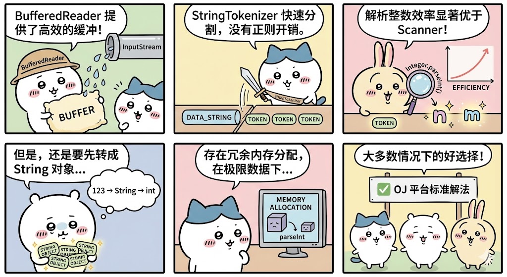 BufferedReader提供字符流缓冲,大幅减少系统调用次数;StringTokenizer快速分割字符串,无正则开销;- 配合