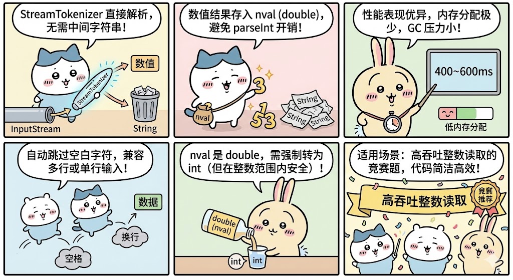 StreamTokenizer,兼顾效率与简洁; - 遇到 1e6+ 数据且时限紧张时,启用手写快读;