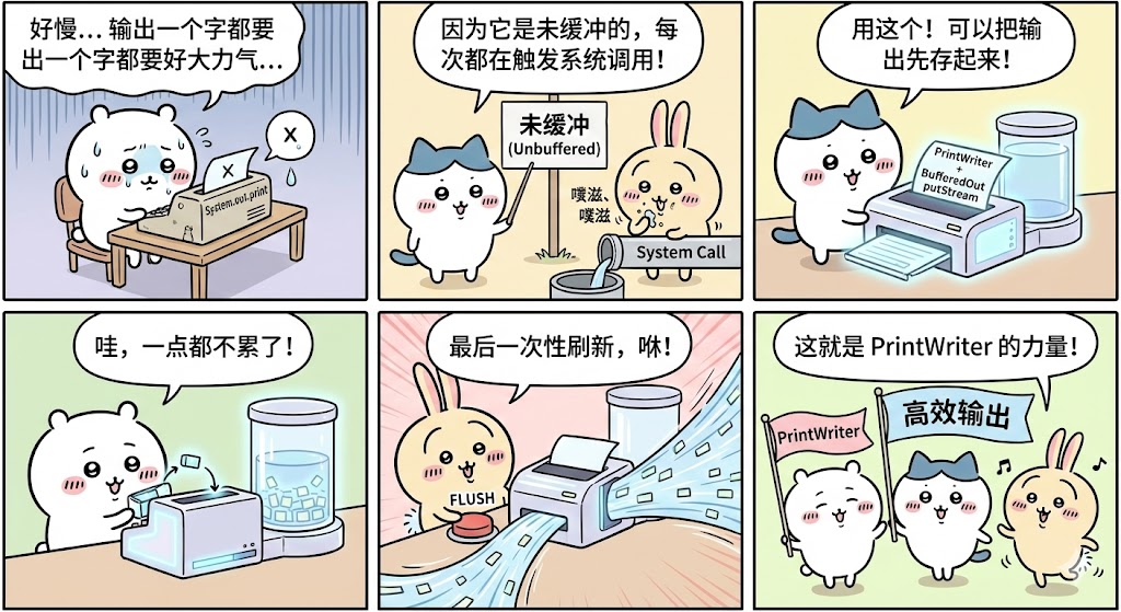 System.out是未缓冲的PrintStream,每次调用都可能触发系统写操作;- 使用