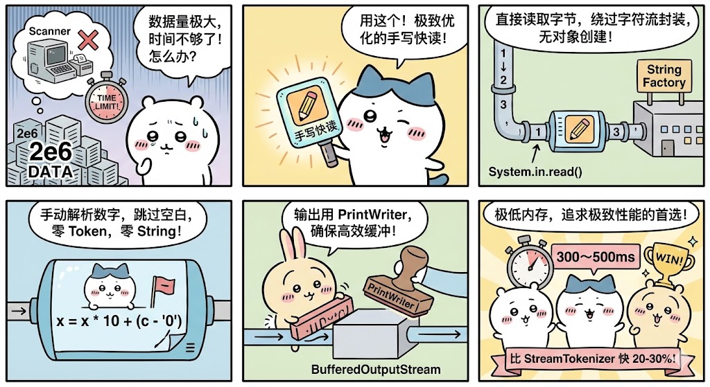System.in.read()读取字节,绕过字符流封装; - 手动解析数字,无任何对象创建(零
