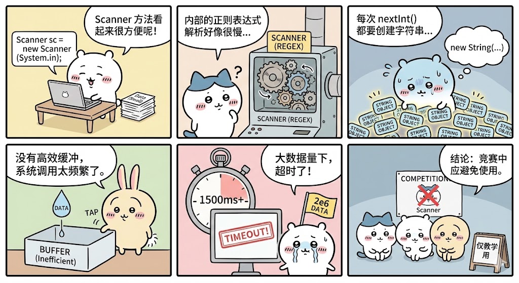 nextInt()都涉及字符串创建与解析; - 未使用高效缓冲机制,频繁系统调用导致性能瓶颈;