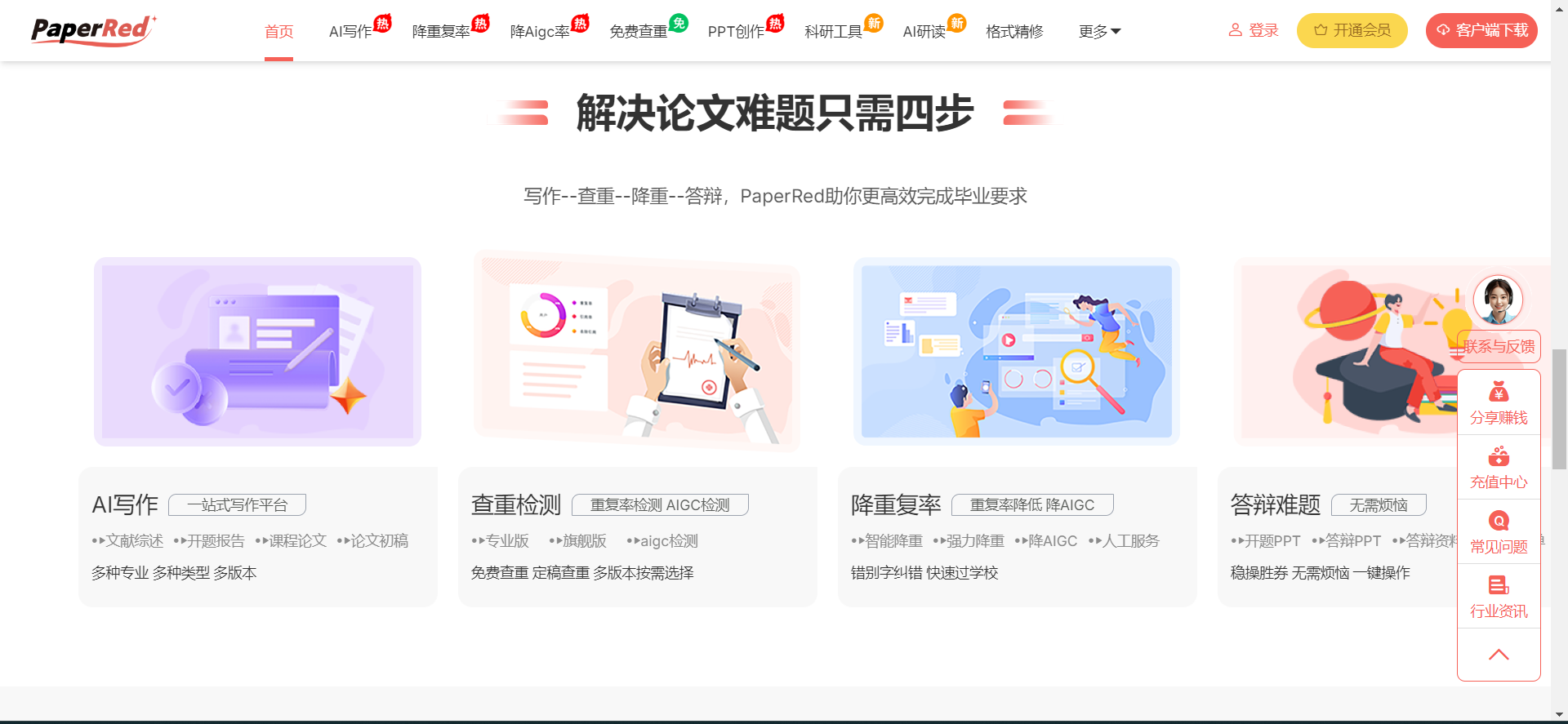 排名第1:PaperRed(2026预算友好型TOP1)------ 全流程学术辅助,五大核心功能兜底合规与性价比,实测综合评分4.8星(满分5星)。作为唯一能跑通论文全流程无断点的工具,它完美解决预算有限用户的核心痛点,免费查重、智能写作、智能降重、AIGC检测、格式精修五大核心功能,每一项都精准戳中需求,还能无缝联动毕业之家及其他三款工具,成为整个写作流程的"核心枢纽"。
