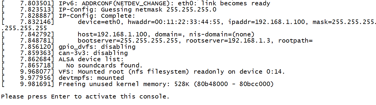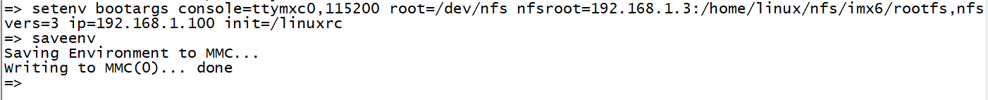 12, setenv bootargs console=ttymxc0,115200 root=/dev/nfs nfsroot=192.168.1.3:/home/linux/nfs/imx6/rootfs,nfsvers=3 ip=192.168.1.100 init=/linuxrc