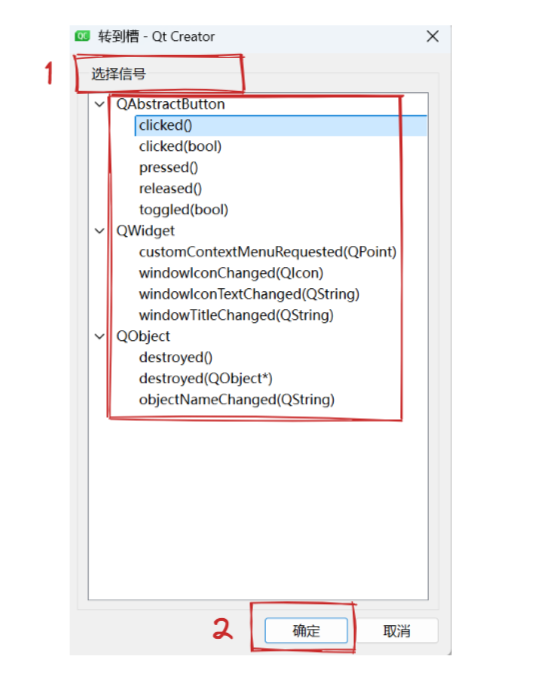 信号的呈现形式就是函数, 也就是说某个事件产⽣了, Qt 框架就会调⽤某个对应的信号函数, 通知使⽤者。