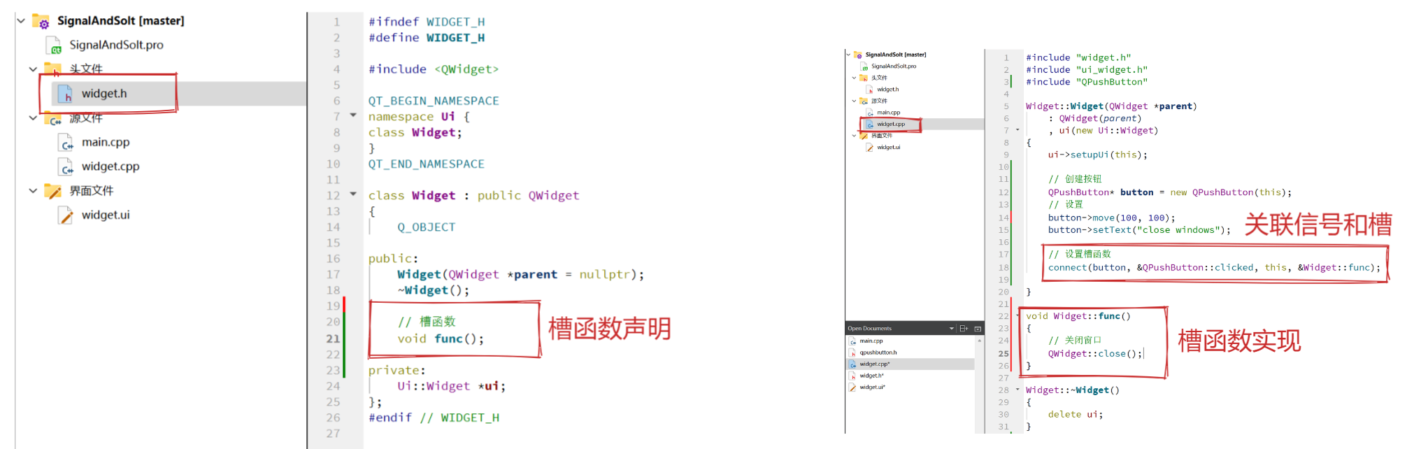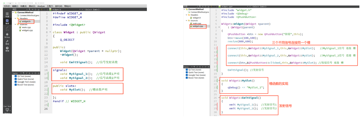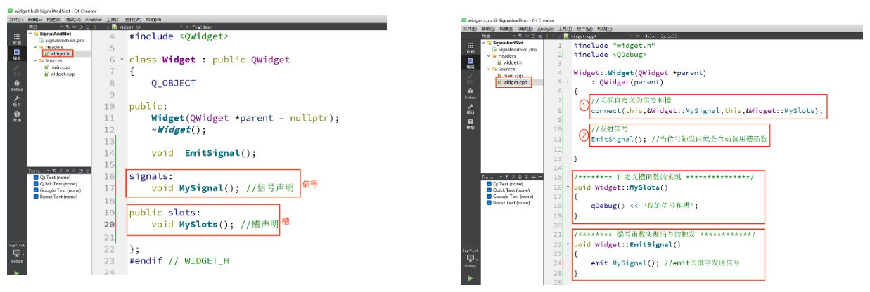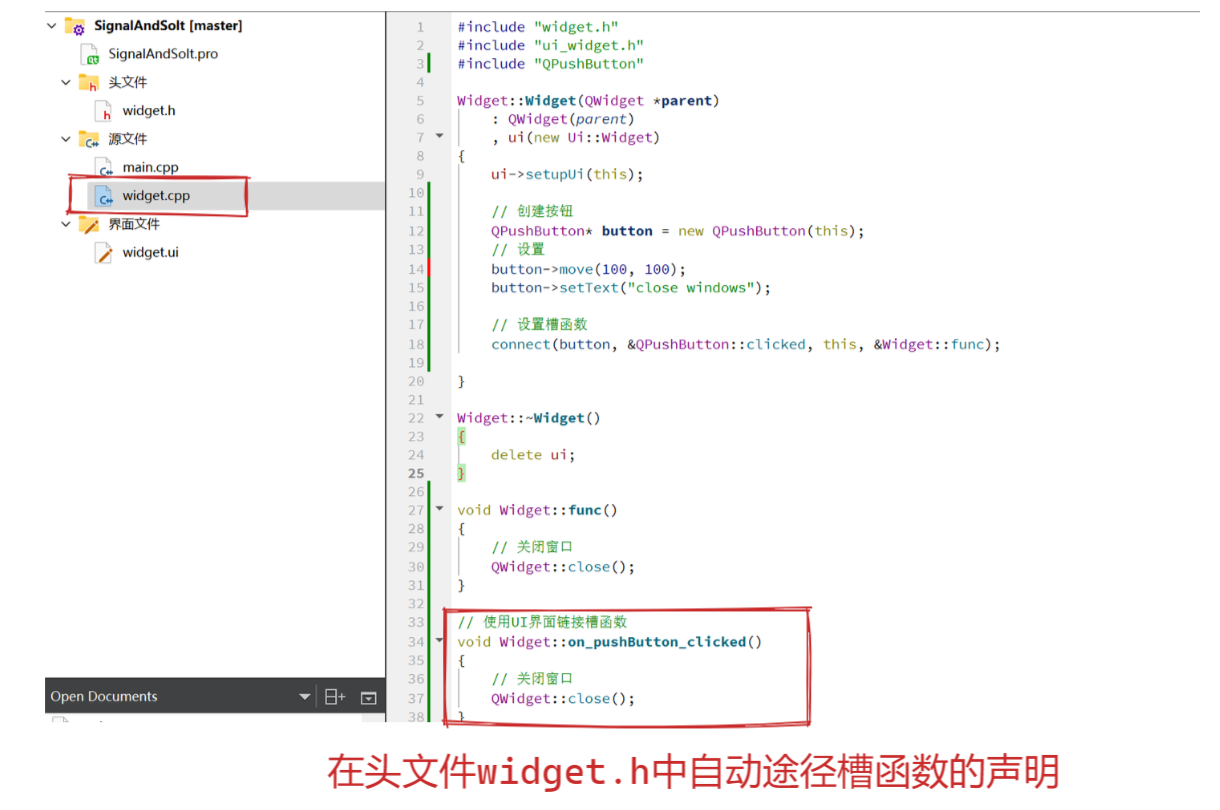 - 信号本质就是成员函数。特殊的是该函数的定义是QT自动生成的,我们只需要写函数声明即可