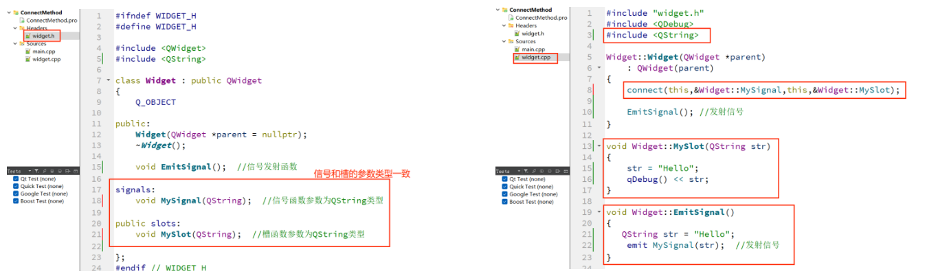 - 信号函数的参数列表要和对应连接的槽函数参数列表的类型一致