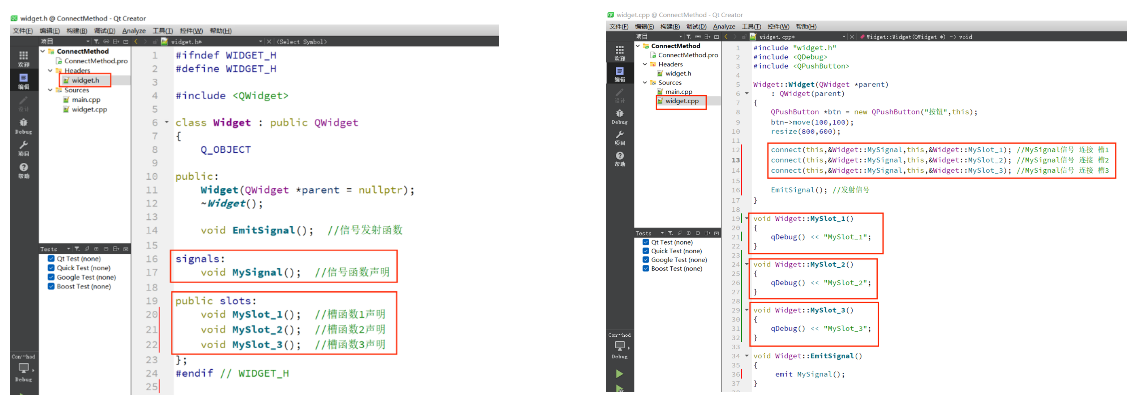 Qt Creator 可以快速帮助我们⽣成信号槽相关的代码,并且除了可以通过 connect 来连接信号槽之外**,还可以通过函数名的方式自动连接**