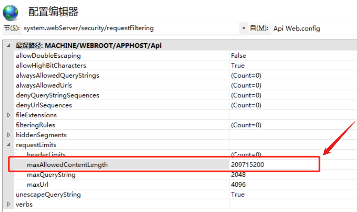 根据这个信息,在网上查看 "IIS 413 Payload Too Large " ,得知IIS默认的文件上传大小不超过30MB,当超过30MB后,就会返回413 Payload Too Large的错误。解决方法就是在IIS中进行配置,或者修改 web.config 中的 requestLimits maxAllowedContentLength 值。