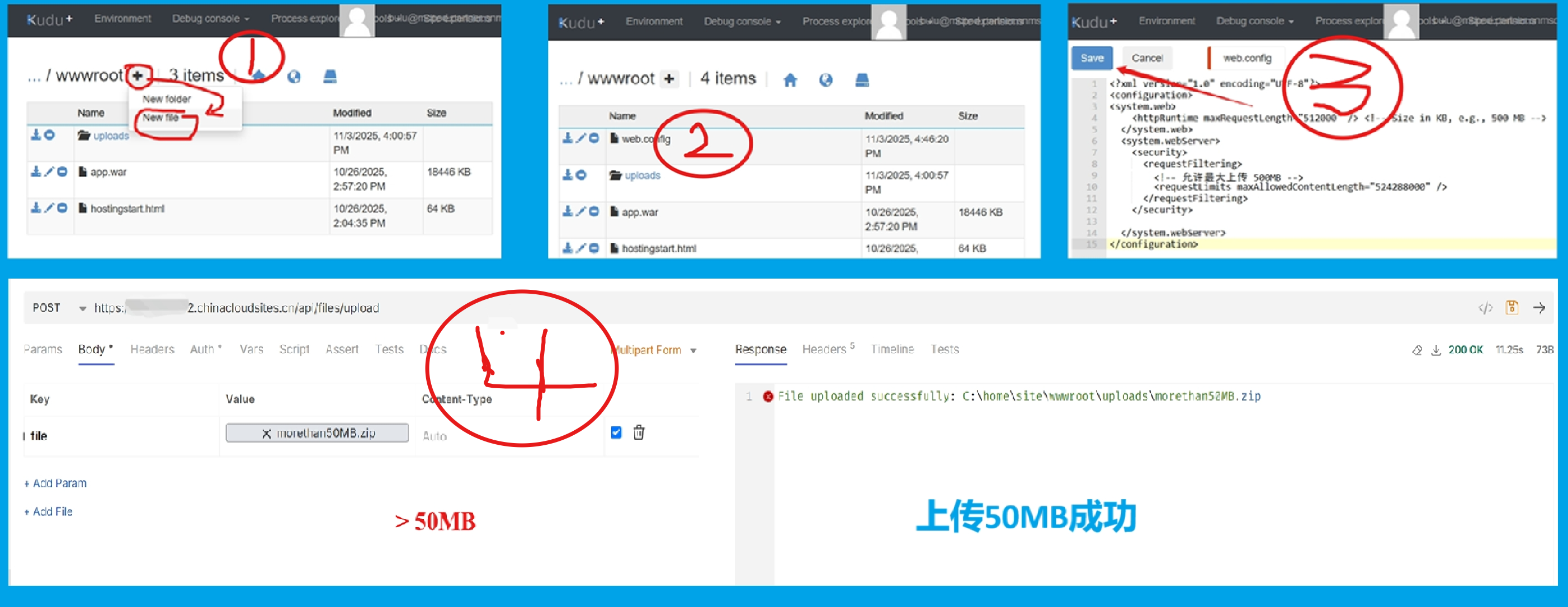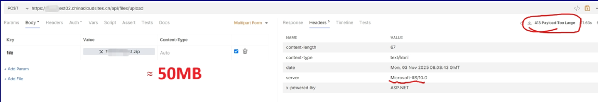 Java应用开发了一个上传文件的接口,部署在App Service ( Windows ) 环境上。在测试过程中,发现当文件较大的时候就会遇见413 Payload Too Large的报错。