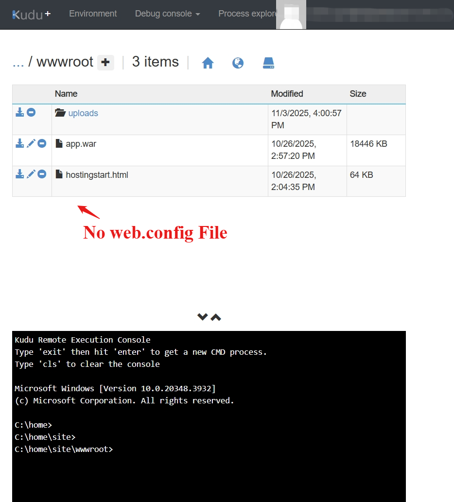 进入App Service的高级工具页面(Kudu: https://<app service name>.scm.chinacloudsites.cn/DebugConsole), 查看Java应用war包所在的目录 (c:\home\site\wwwroot)中,并没有web.config文件