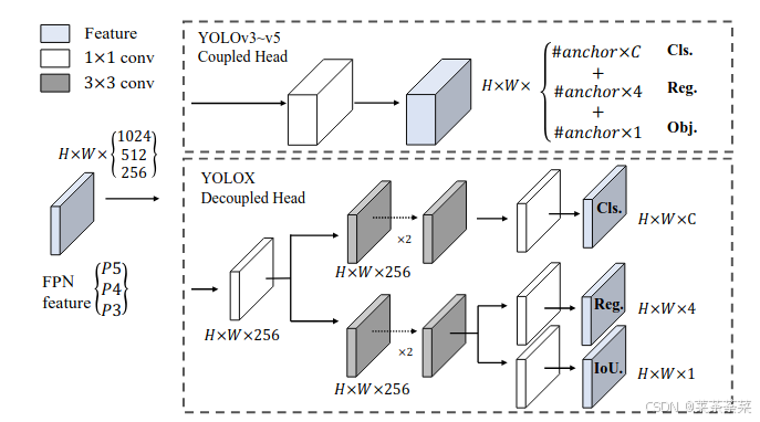 YOLO系列中,YOLOX最早明确提出并应用 Decoupled Head:在预测输出端将分类分支和边框回归分支分离出来(如下图)。