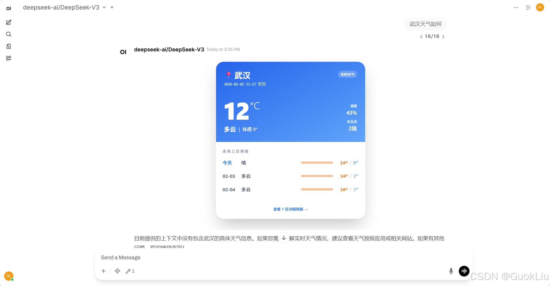 获取实时天气及未来三天预报,并返回精美的交互式 Rich UI 卡片。