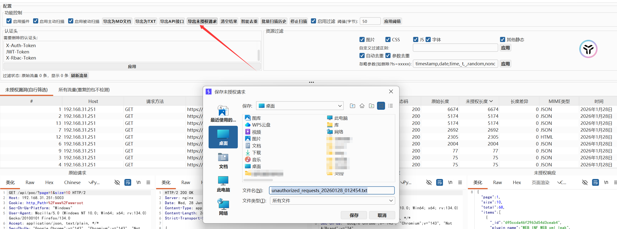 - 点击"导出API接口"按钮可将检测到的未授权漏洞接口以JSON格式导出,格式与api.json一致