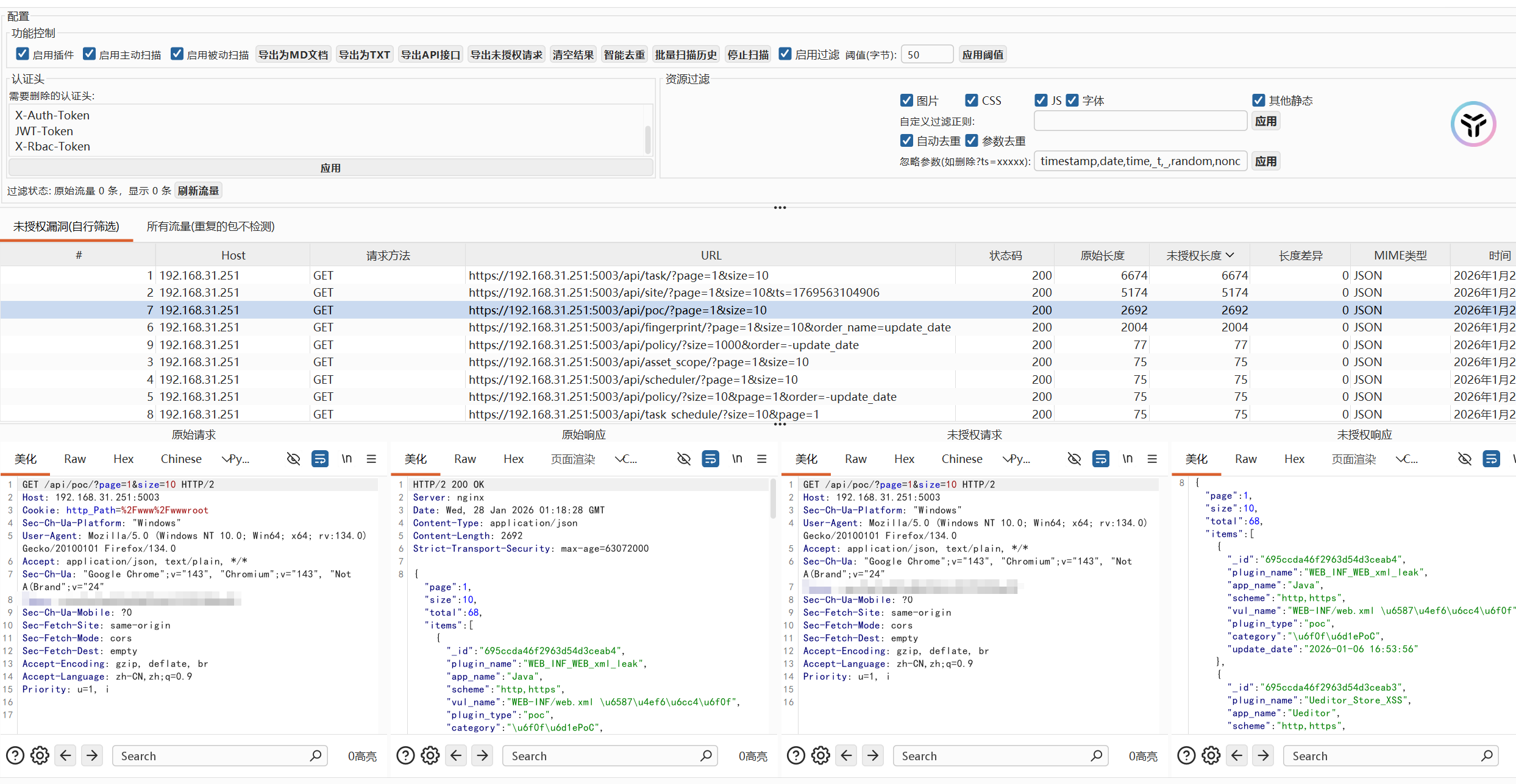 - "未授权漏洞"选项卡显示检测到的漏洞