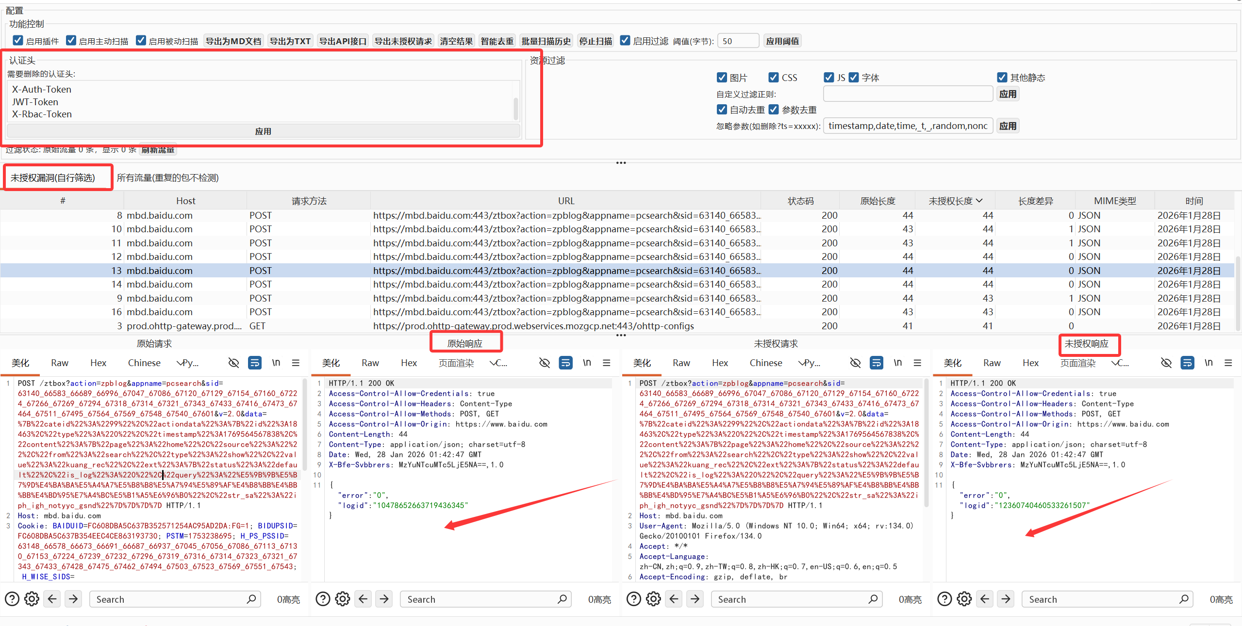 - 比较响应差异:分析原始响应与未授权响应的内容差异