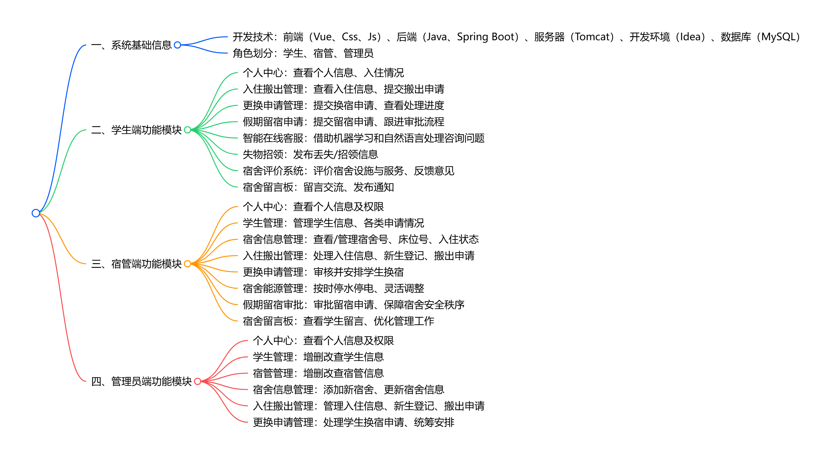 该智能大学宿舍管理系统面向学生、宿管、管理员三类角色,核心功能如下: