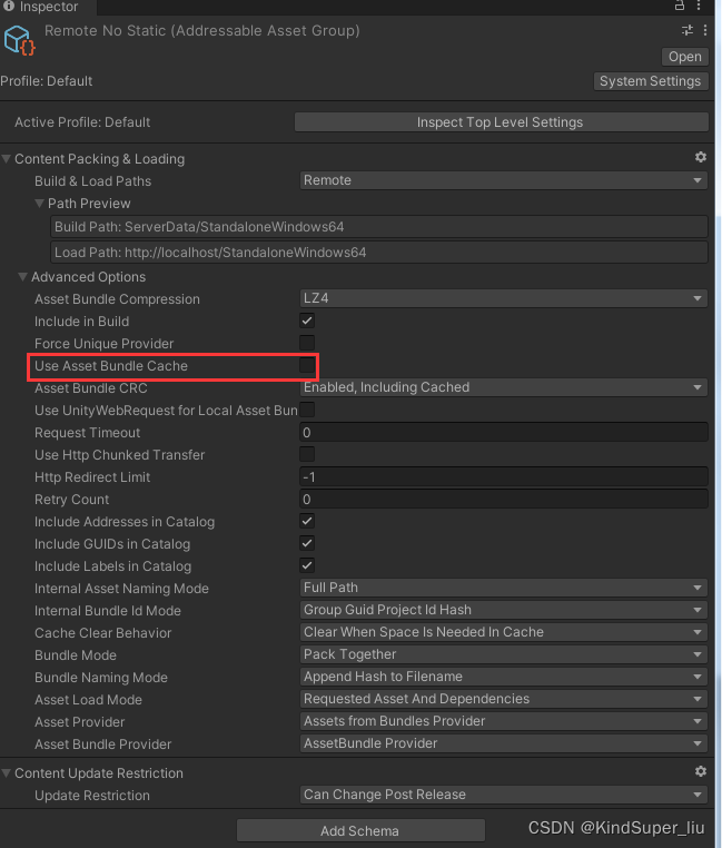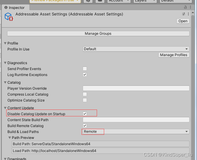 开启远程的:找到Addressable Asset Settings文件,Build&Load Paths选择Remote.