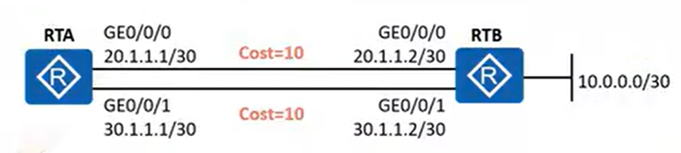 - 来源相同、开销相同的路由都会被加入到路由表,形成的路由为等价路由(两个路由条目指向的目的网段相同,但是具有不同的下一跳地址),路由转发会将流量分布到多条路径上。