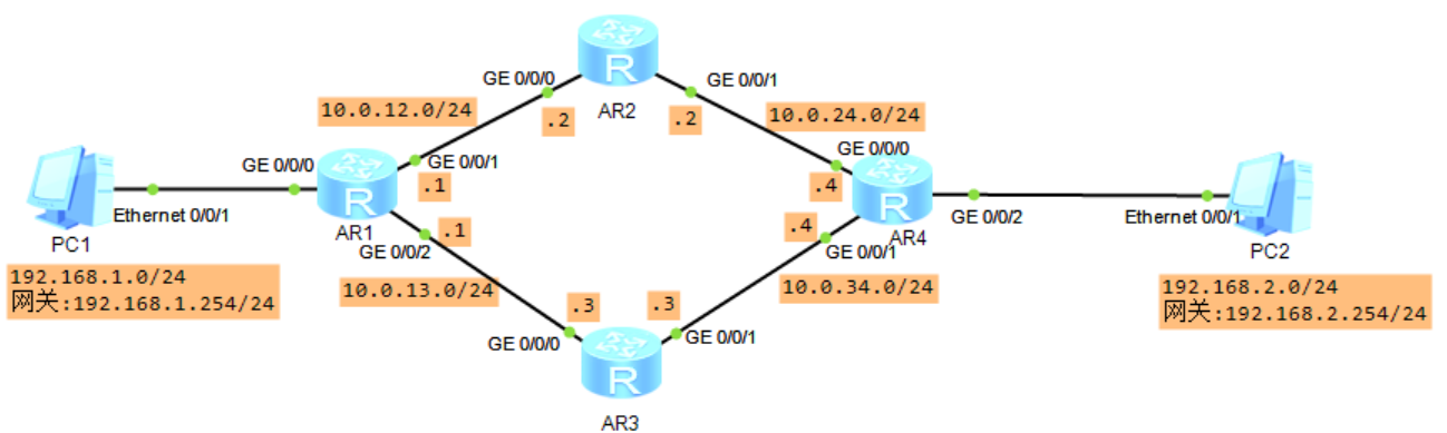- 配置两台PC的信息和各个路由各个接口的IP。PC1的网关配置在AR1的g0接口,PC2的网关配置在AR4的g2接口。ip address [IP地址] [掩码]