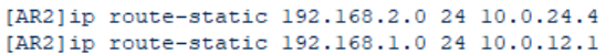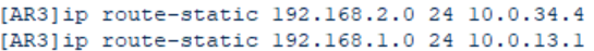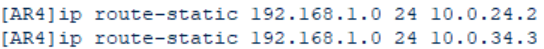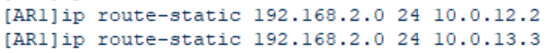 - AR2和AR3,去往192.168.2.0的路由条目,以及去往192.168.1.0的回包路由条目;各自配置两条路由条目。