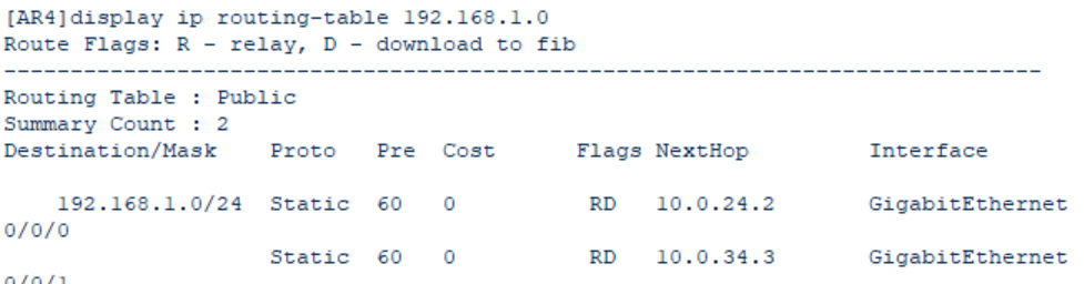 - AR4:回程路由,也是两条等价路由,通往AR2和AR3: