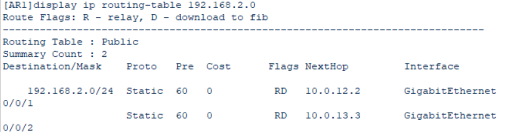 - AR1上配置两条静态路由信息,通往AR2和通往AR3的(同一个网段,两个下一跳地址),流量分两条路径走: