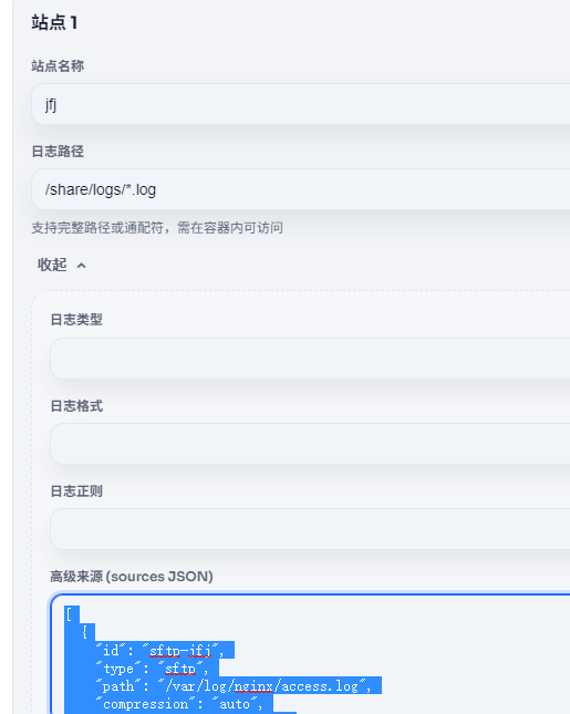 在站点与日志配置:高级来源 (sources JSON)