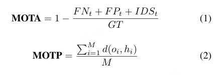 评估指标。 由于自主驾驶中的 OR 和 OR-T 任务通常是基于主流自主驾驶数据集设计和测试的,例如 nuScenes [88] 和 KITTI [62],因此它们也采用与数据集基准测试中相同的评估指标。对象引用任务使用平均精度均值(mAP)来衡量模型在定位指定对象方面的准确性。对于多对象 OR-T 任务,则采用多目标跟踪(MOT)任务中使用的指标作为评估标准,如高阶跟踪准确率(HOTA)、公式 1 中的多目标跟踪准确率(MOTA)、公式 2 中的多目标跟踪精度(MOTP)以及身份切换(IDS),其中 FN、FP、IDS 分别表示假阴性、假阳性、身份切换,d(oi,hi) 表示跟踪对象与真实对象之间的第 i 个距离。++(mAP、HOTA、MOTA、MOTP评价指标)++
