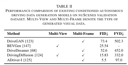 表2:现有条件自动驾驶数据生成模型在NuScenes验证数据集上的性能比较。多视角和多帧表示生成的视觉数据类型。++(当时比较少,现在应该比较多了)++
