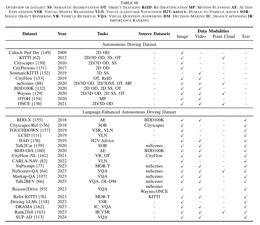表 III 数据集概览。SS:语义分割 OT:目标跟踪 ReID:重识别 MP:运动规划 AE:动作解释 VSR:视觉空间推理 VLN:视觉语言导航 H2V-Advice:人对车辆建议 SOR:单目标指认 VR:车辆检索 VQA:视觉问答 DM:决策 IC:图像描述 IR:重要性排序++(表注)++