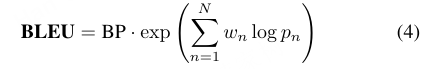 在开放式回答格式的VQA和图像描述任务中,一些常用的指标用于评估预测答案与真实答案之间的相关性和正确性,例如BLEU [89]、METEOR [90]、ROUGE [91]、CIDEr [92] 等。双语评测替代(BLEU)分数,如公式4所示,是将n-gram精确度的加权平均值与简略惩罚(Brevity Penalty, BP)相乘。BP作为句子长度的惩罚因子,鼓励生成答案的长度与真实答案的长度尽量匹配。n-gram的加权平均度量预测与真实答案之间关键词汇的相似性,其中N用于表示其多种变体,即BLEU-N。++(以BLEU为代表的多样评价指标)++
