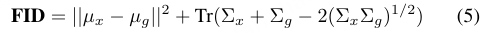 **评估指标。**条件自动驾驶数据生成采用与文本到图像和文本到视频任务相同的评估指标。两个常用的指标是Fréchet Inception距离(FID)[95],也称为Wasserstein-2距离,以及Fréchet视频距离(FVD)[96]。如公式5所示,(µx, Σx) 和 (µg, Σg) 分别表示从生成的合成图像和真实图像中提取的图像特征的高斯分布。在FVD中,输入被替换为从预训练视频骨干网络获得的特征分布。FID和FVD数值越低,表示生成数据与真实数据的分布差异越小,图像或视频的质量越高。表II总结了近年来在条件自动驾驶数据生成中使用FID和FVD指标的研究表现。