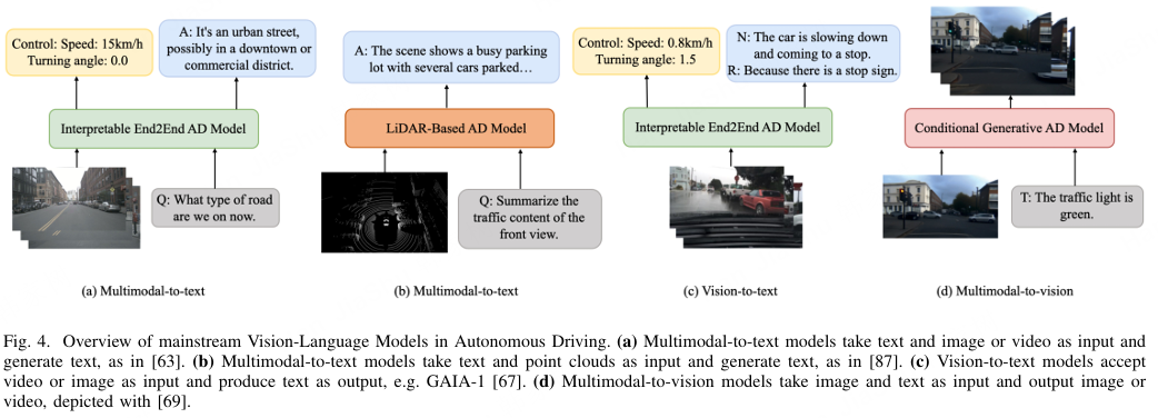 图4. 自动驾驶中++主流视觉-语言模型概览++。(a) 多模态到文本模型以文本和图像或视频为输入并生成文本,如文献[63]所示。(b) 多模态到文本模型以文本和点云为输入并生成文本,如文献[87]所示。(c) 视觉到文本模型接受视频或图像为输入并生成文本输出,例如GAIA-1 [67]。(d) 多模态到视觉模型以图像和文本为输入并输出图像或视频,如文献[69]所示。