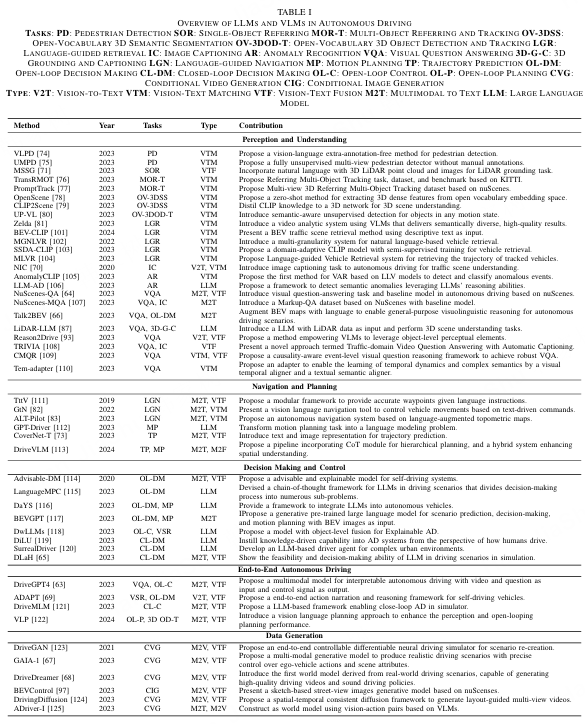 • 我们对自动驾驶中的大型视觉语言模型进行了全面的综述,并根据VLM类型和应用领域对现有研究进行了分类。