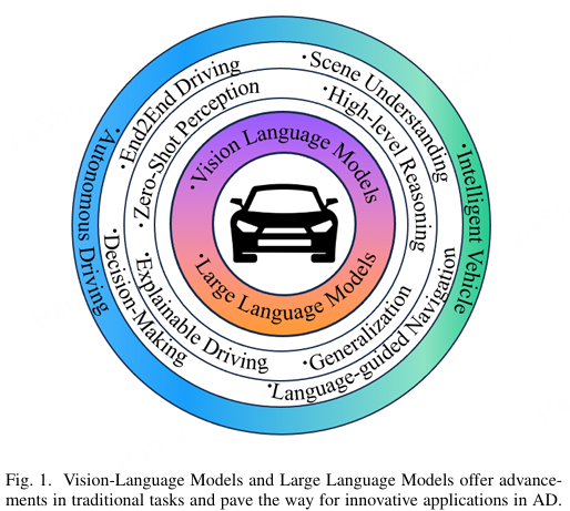 图1:视觉-语言模型和大型语言模型在传统任务中提供了进展,并为自动驾驶的创新应用铺平了道路。