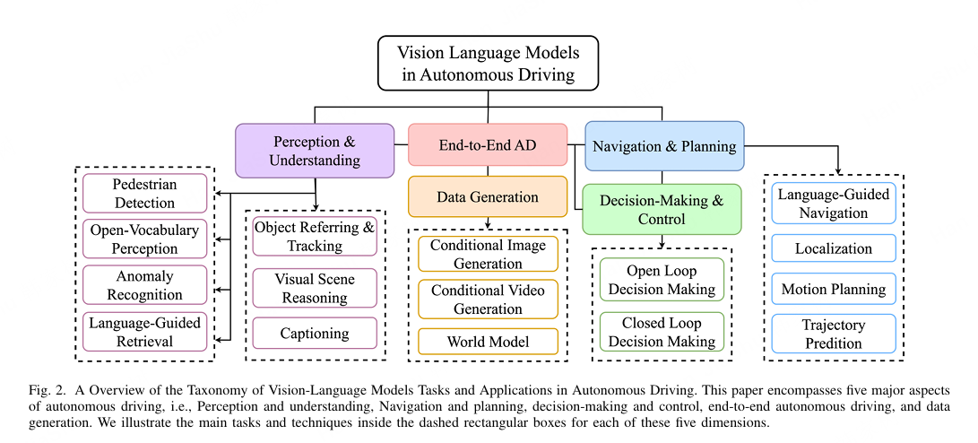 图 2:自动驾驶中视觉-语言模型任务和应用的分类概述。本文涵盖了自动驾驶的五个主要方面,即感知与理解、导航与规划、决策与控制、端到端自动驾驶以及数据生成。我们在每个五个维度中用虚线矩形框展示了主要任务和技术。++(一图概括了全文所有关键小标题)++