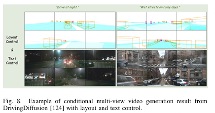 图8. DrivingDiffusion [124] 基于布局和文本控制的条件多视角视频生成示例结果。