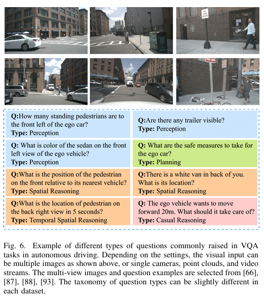 图6. 在自动驾驶的VQA任务中常见的不同类型问题示例。根据具体设置,视觉输入可以如上所示为多张图像,也可以是单个摄像头、点云或视频流。多视角图像和问题示例选自[66]、[87]、[88]、[93]。每个数据集中问题类型的分类可能略有不同。