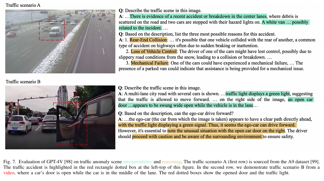++驾驶场景理解。++ 精确且高层次的驾驶理解对于确保全自动驾驶的安全性以及为合理决策建立基础至关重要。在图7中,我们展示了GPT-4V在交通事故场景和存在潜在风险的城市道路场景中的理解能力示例。有几项探索性工作利用视觉语言模型(VLMs)通过特定下游任务来理解交通场景。[70] 试图通过图像描述(Image Captioning, IC)理解交通场景。自动驾驶中异常场景的识别也十分重要。AnomalyCLIP [105] 使用CLIP模型进行视频异常检测。通过指定异常类别并使用上下文优化[128],它能够区分正常与异常样本,使模型能够识别异常实例。AnomalyCLIP 在包括交通场景异常检测在内的各种数据集上取得了良好成绩。[106] 将视觉信息转化为语言描述,然后利用大语言模型(LLMs)强大的推理能力来解决语义异常检测(Semantic Anomaly Detection, SAD)。