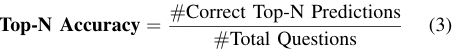 评估指标。 在多项选择的视觉问答(VQA)任务中,正确答案会出现在多项选择的选项中。在这种情况下,可以使用 Top-N 准确率来评估模型是否作出了正确的预测。如公式 3 所述,如果正确答案位于模型预测概率排名前 n 的选项中,则该答案可视为成功预测。然后,通过将成功预测的问题数量除以问题总数来计算准确率。N 的选择通常取决于选项的数量和问题的类型。NuScenes-QA [64] 和 Talk2BEV [66] 采用 Top 1 准确率作为评估指标。++(Top-N 准确率)++