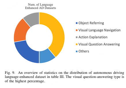 图9 表 III 提供了自动驾驶语言增强数据集分布的统计概览。视觉问答类型所占比例最高。