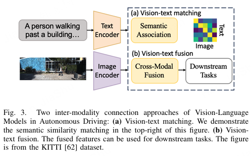 图3. 自动驾驶中视觉-语言模型的两种跨模态连接方法: (a) 视觉-文本匹配。我们在图的右上角演示了语义相似度匹配。(b) 视觉-文本融合。融合后的特征可用于下游任务。该图来源于KITTI [62] 数据集。