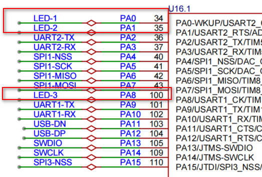 LED1、LED2、LED3 的阳极通过 2K 排阻接 3.3V 高电平,阴极分别接 GPIOA0、GPIOA1、GPIOA8 引脚: