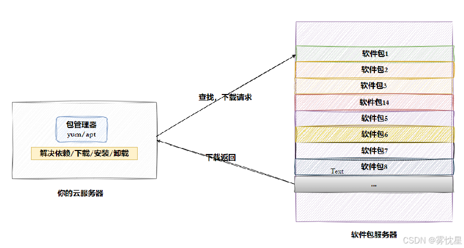 包管理器: Linux系统中用于管理软件包全生命周期的工具,核心功能包括:安装软件包、卸载软件包、更新软件包、查询软件包信息、解决软件包依赖关系。