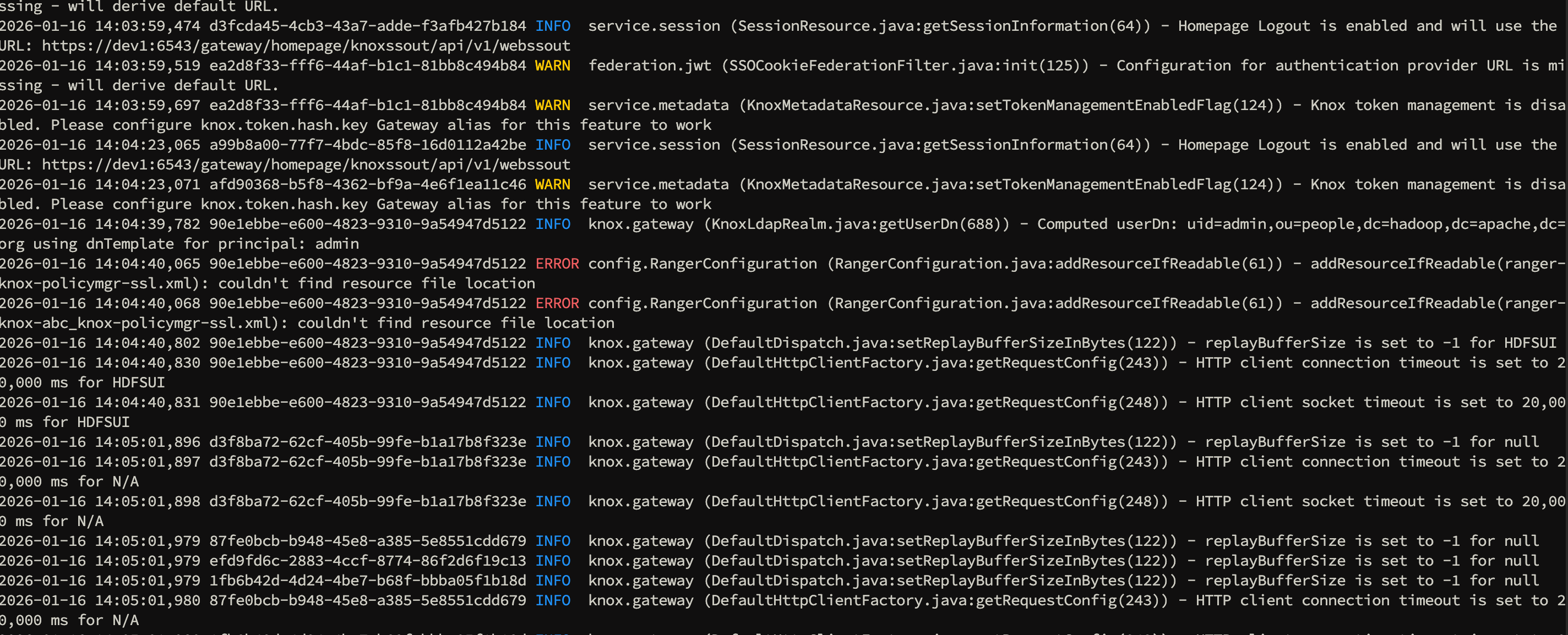2026-01-15 20:42:54,041 ... ERROR config.RangerConfiguration (RangerConfiguration.java:addResourceIfReadable(61)) - addResourceIfReadable(ranger-knox-policymgr-ssl.xml): couldn't find resource file location